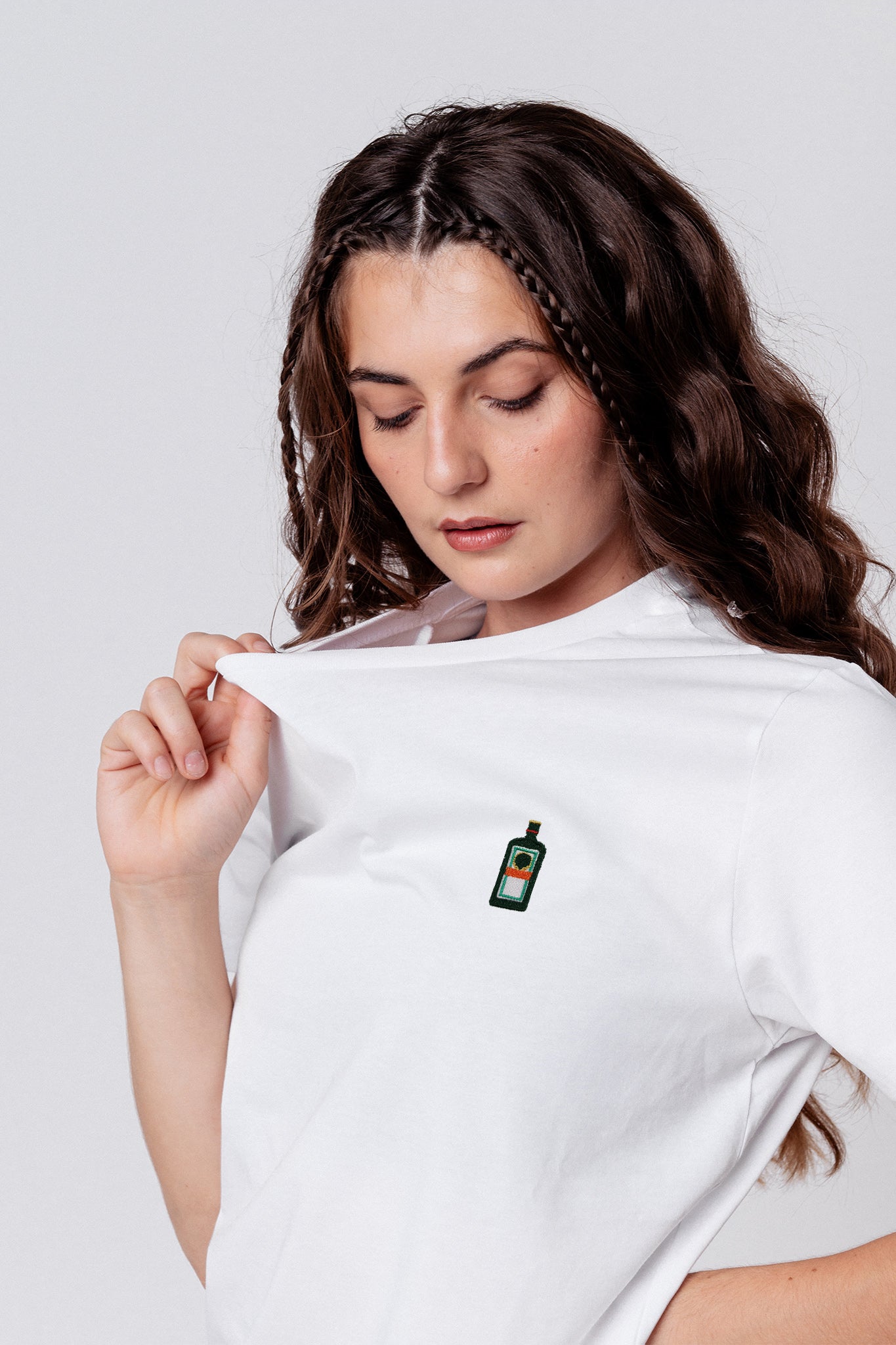 Besticktes Bio Baumwoll Unisex T-Shirt mit schwerem Stoff (190gsm) und der offiziellen gestickten Jägermeister Flasche
