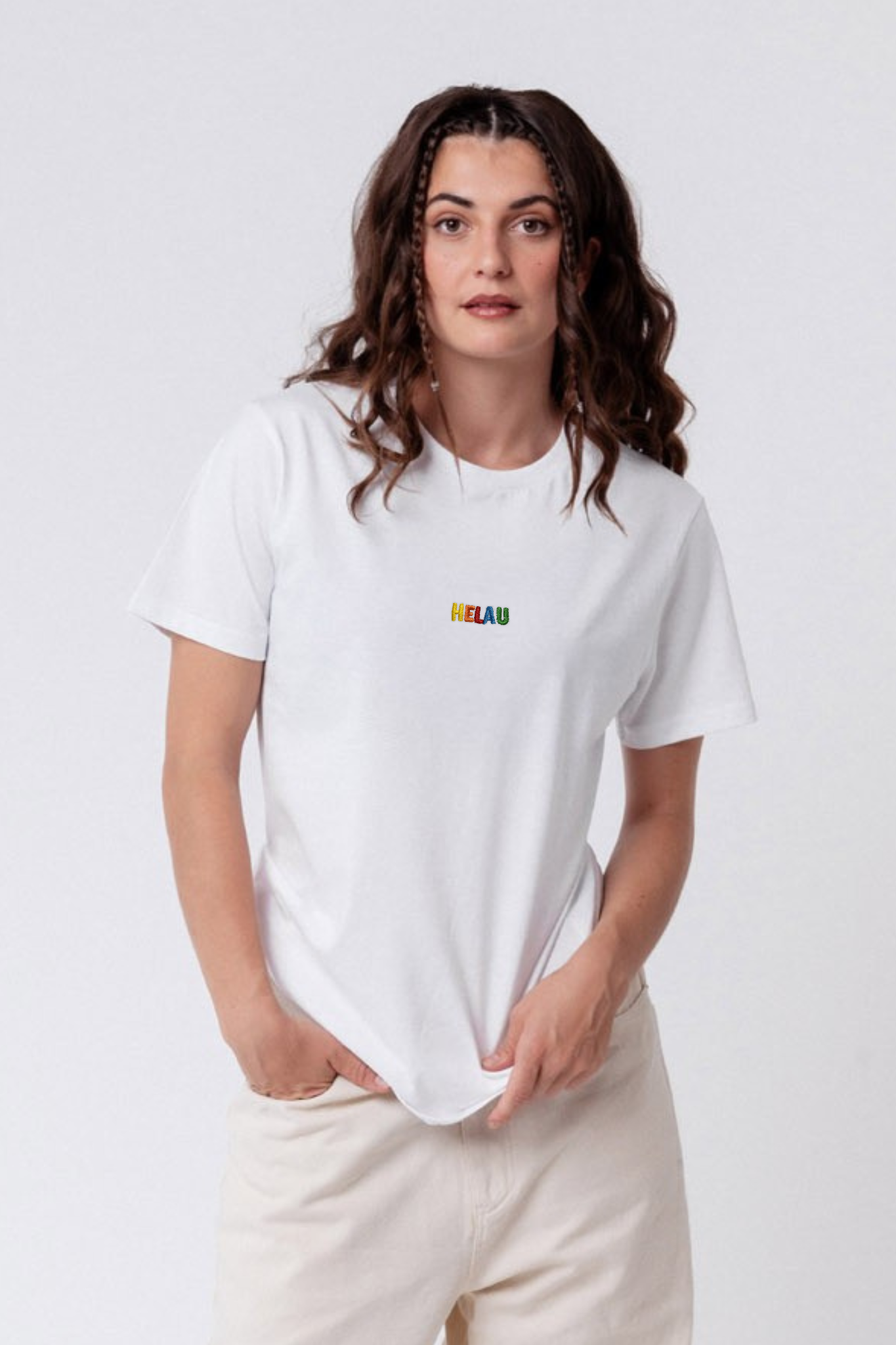Besticktes Bio Baumwoll Unisex T-Shirt mit schwerem Stoff (190gsm) und drei gesticktem Karneval Schriftzügen zur Auswahl: Helau, Alaaf, Kamelle