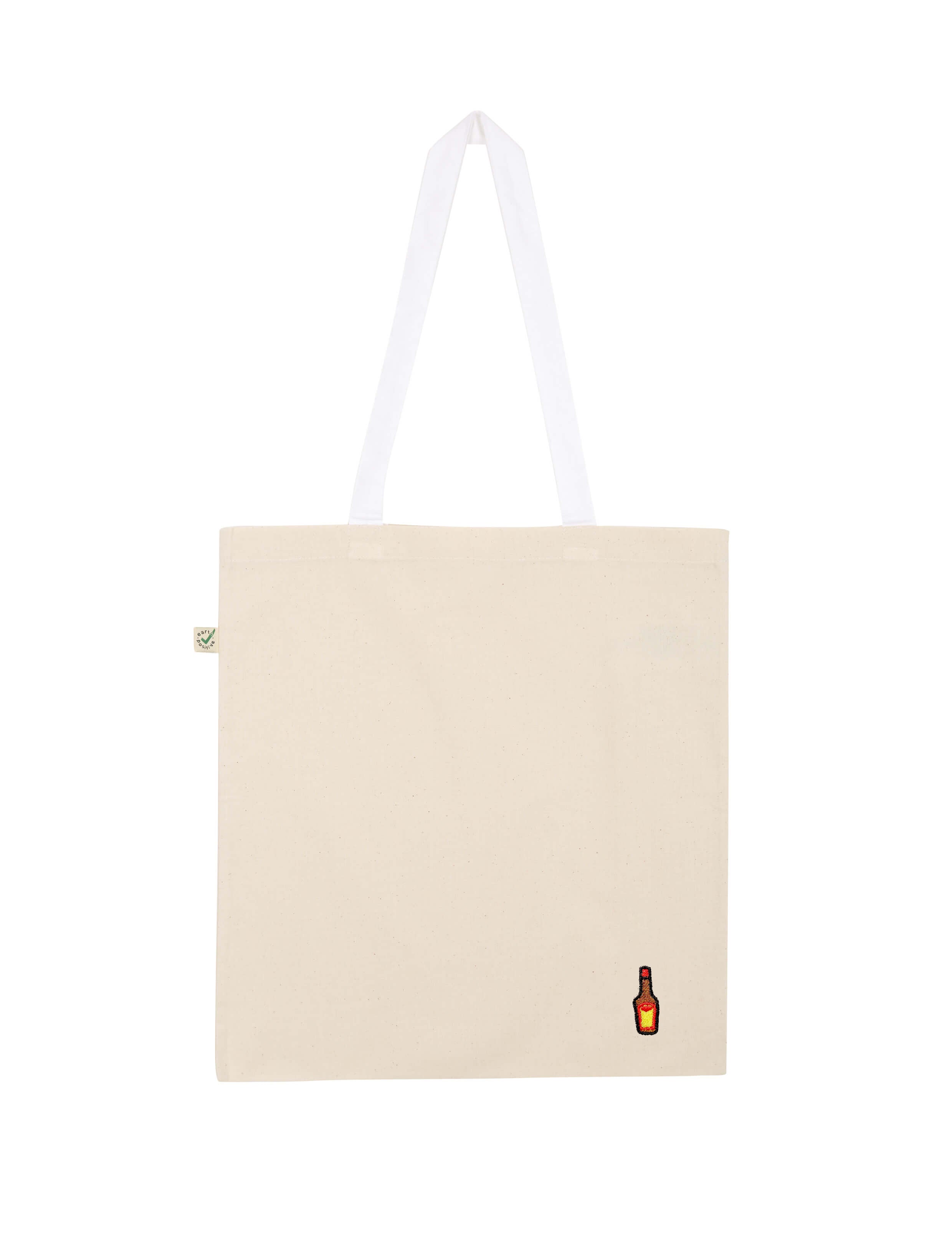 Bestickte, fair produzierte Bio-Baumwoll-Tragetasche im Würze Fix Design.