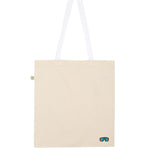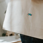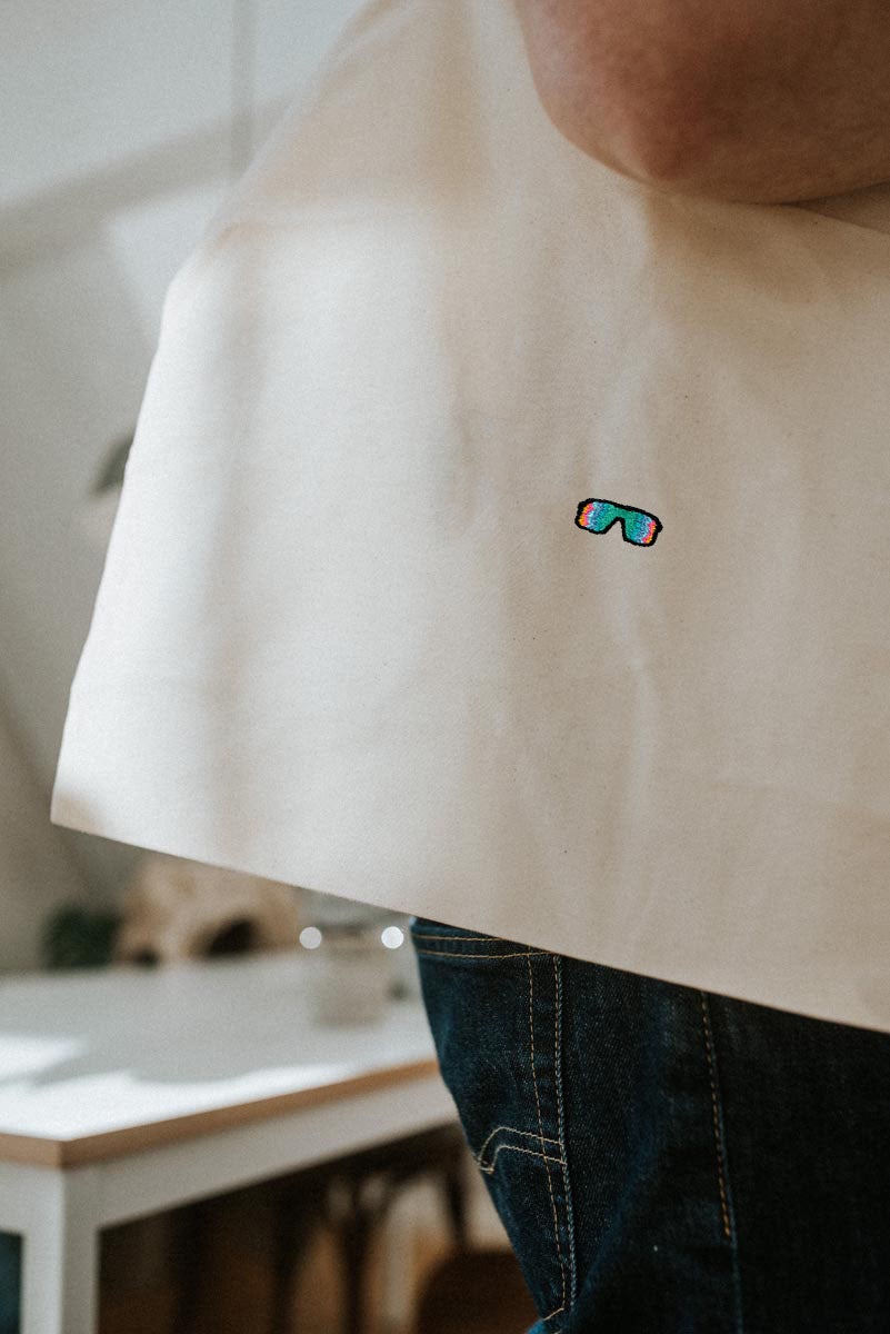 Embroidered, fairly produced organic cotton carrier bag in a fast glasses design.