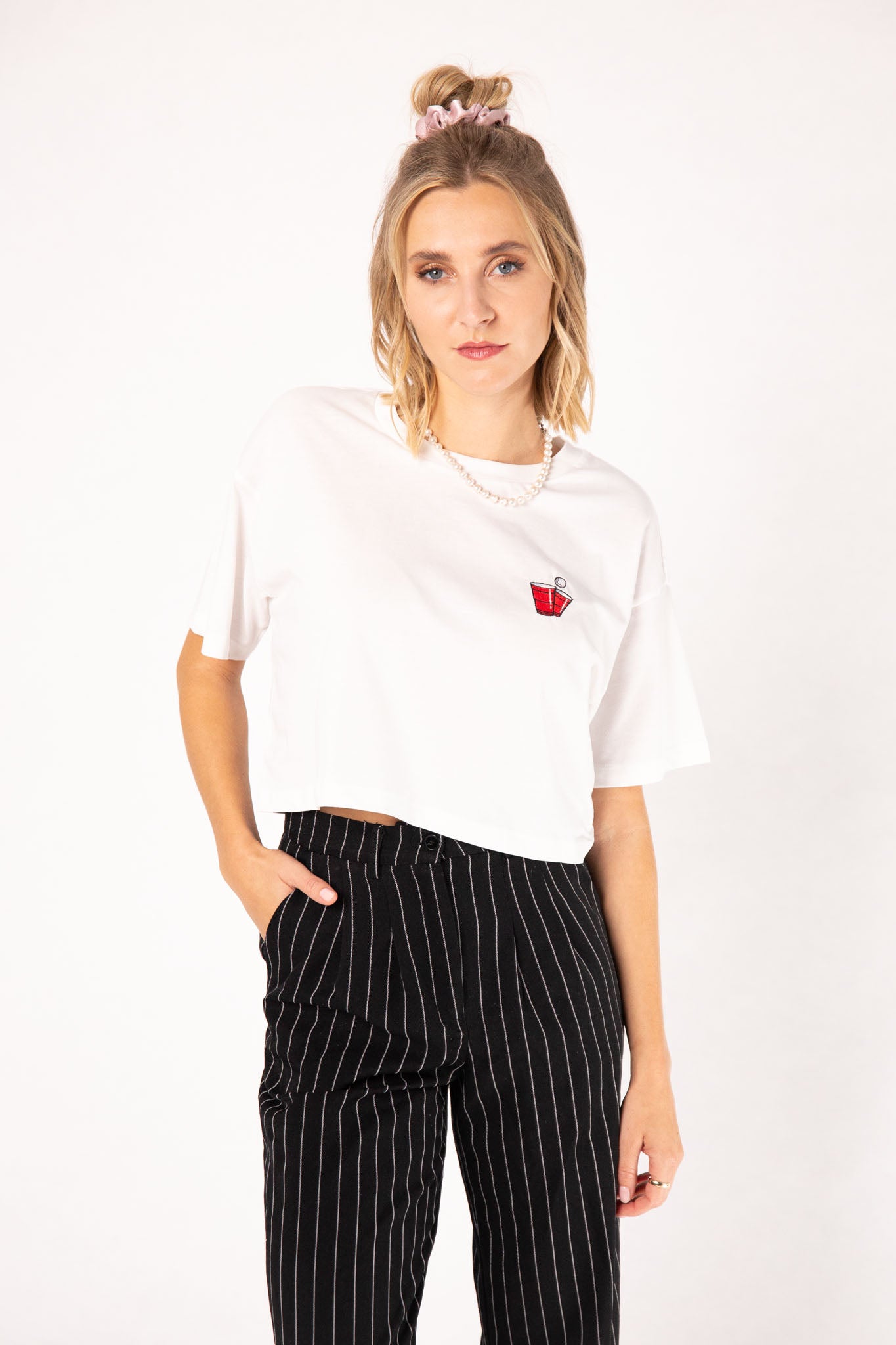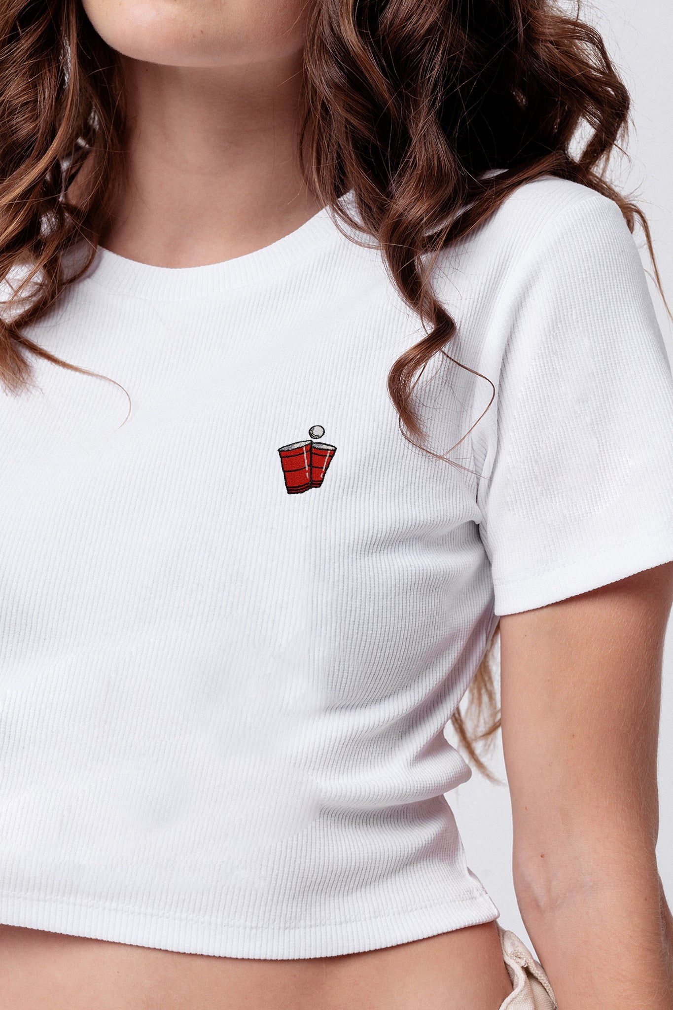 Super hochwertiges Bio Baumwoll Cropped T-Shirt mit gesticktem Beerpong Design in drei verschiedenen Schnitt-Varianten: Ripped, Regular & Oversized