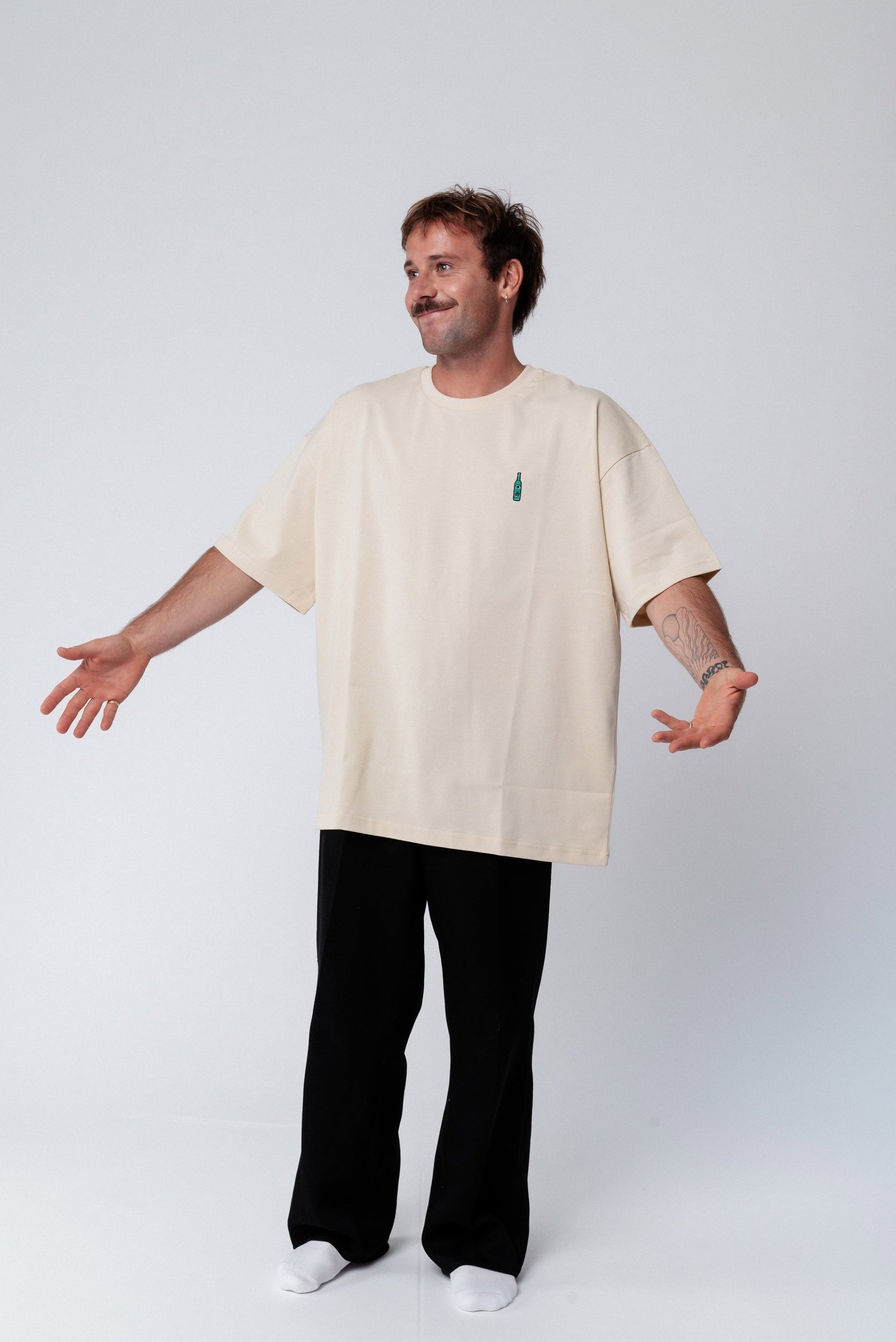 Heavy Oversized Bio Baumwoll T-Shirt mit extra schwerem Stoff (230gsm) und der offiziellen gestickten Pfeffi Flasche