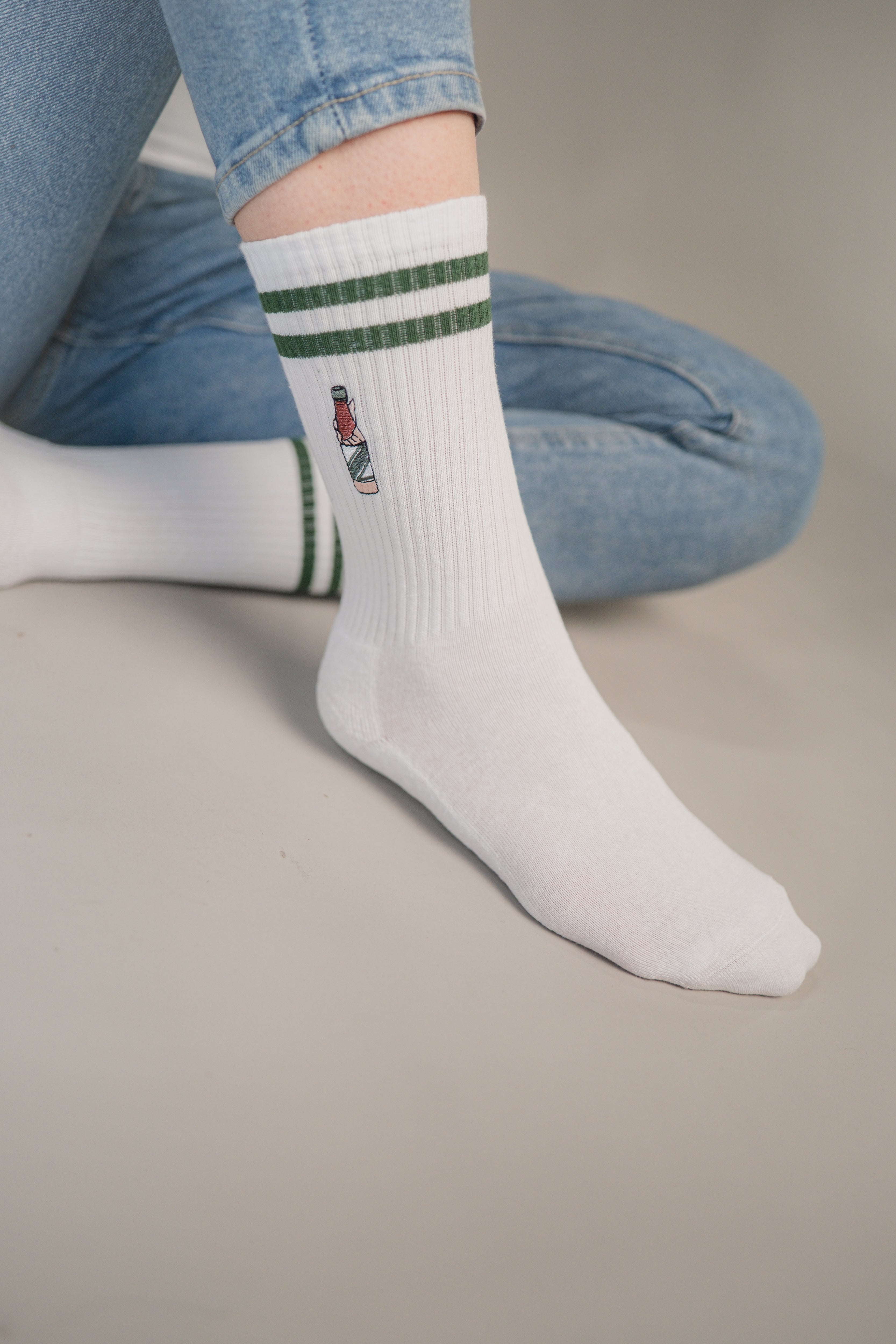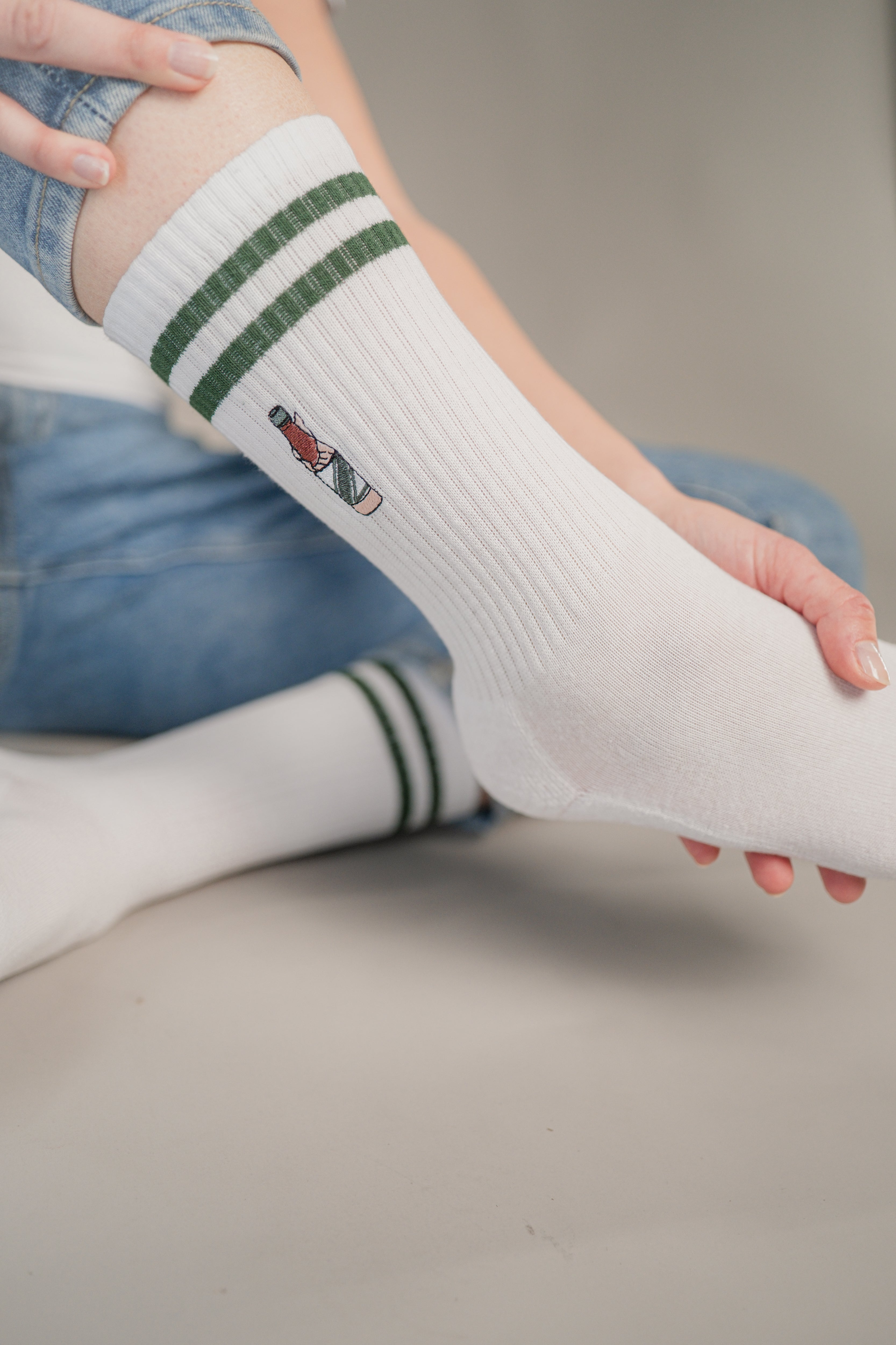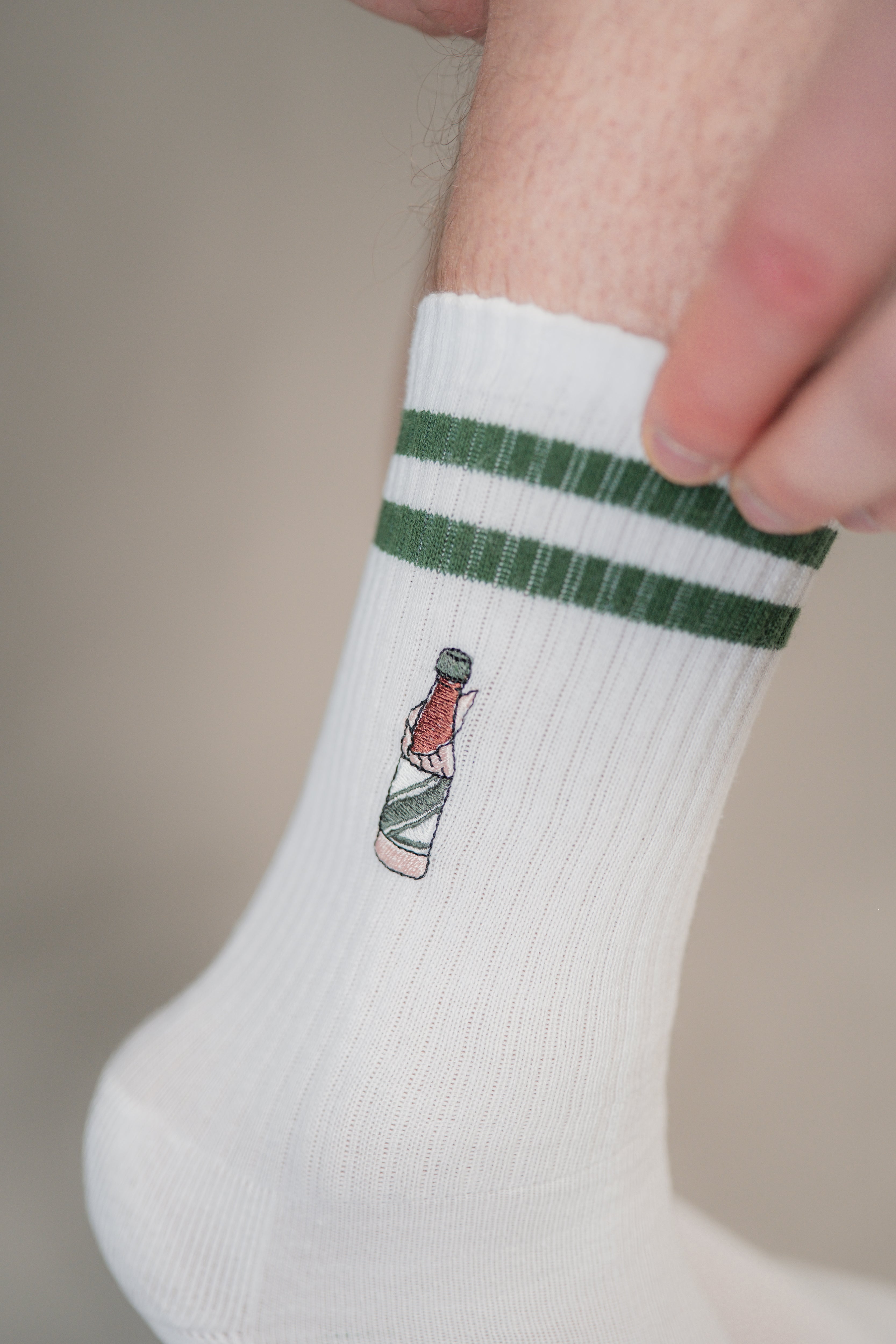 Super high-quality organic cotton crew socks with official embroidered Underberg® design and green stripes