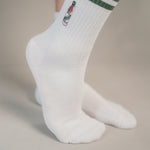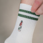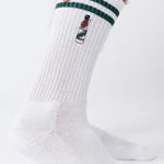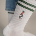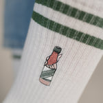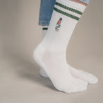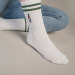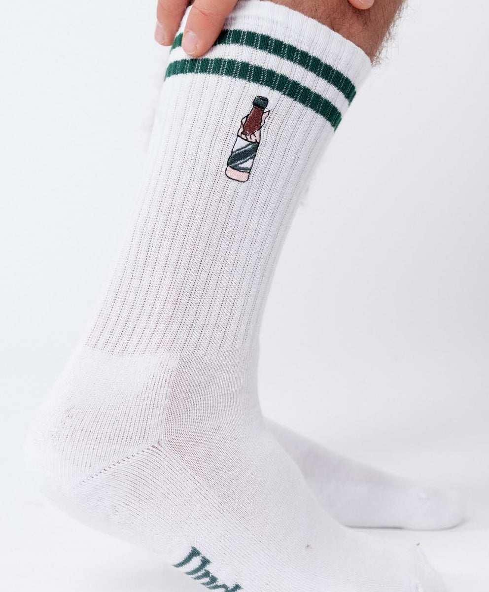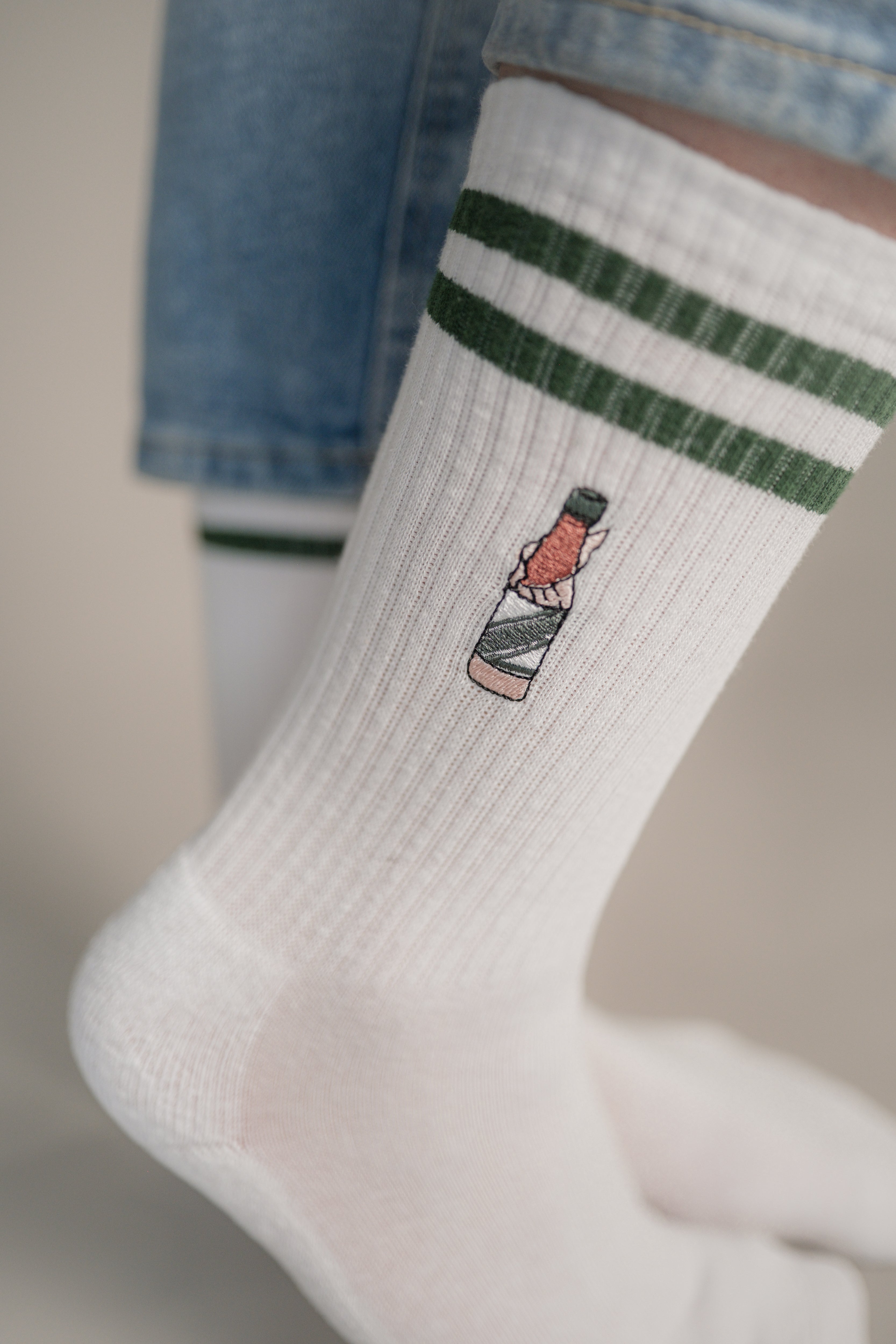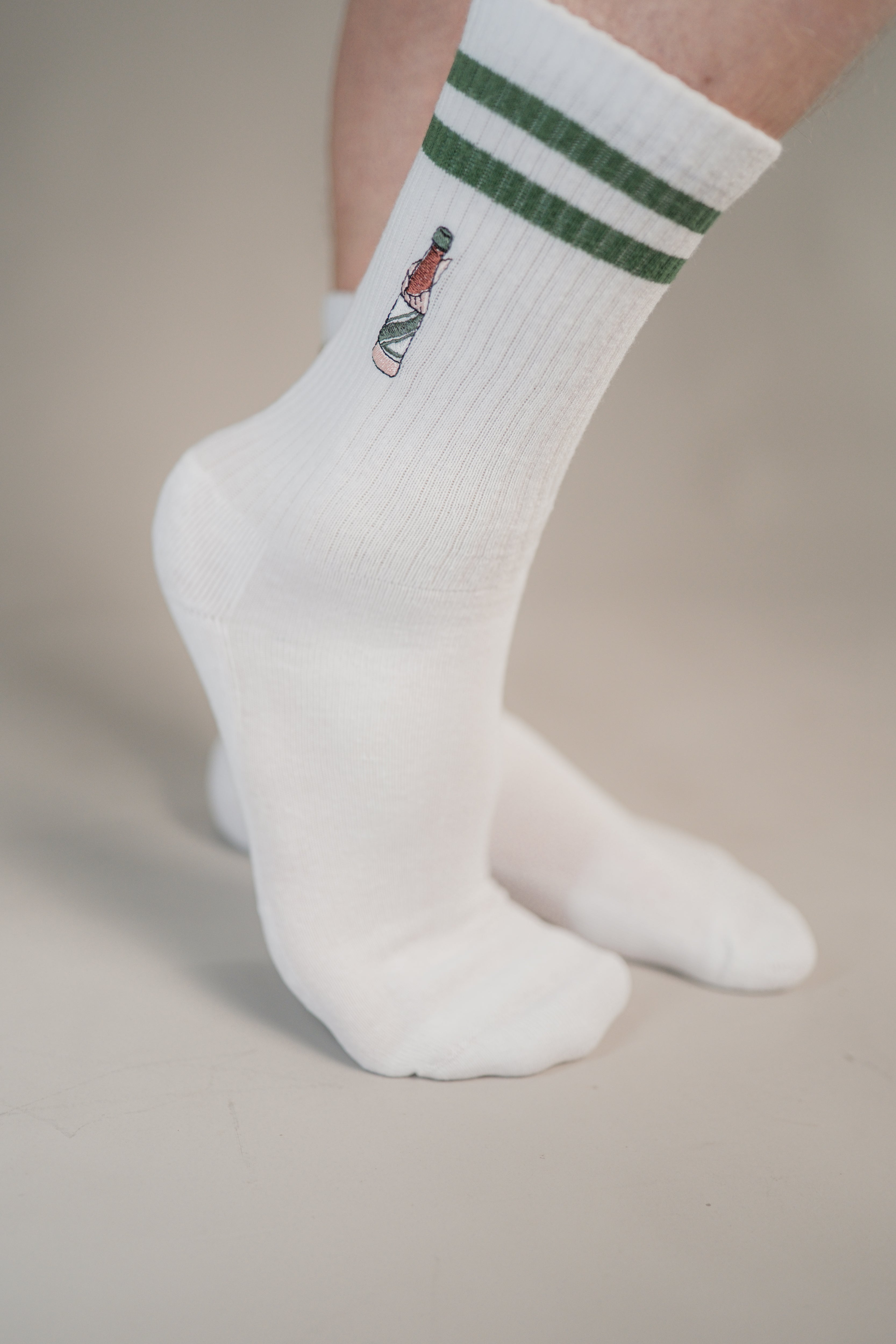 Super high-quality organic cotton crew socks with official embroidered Underberg® design and green stripes
