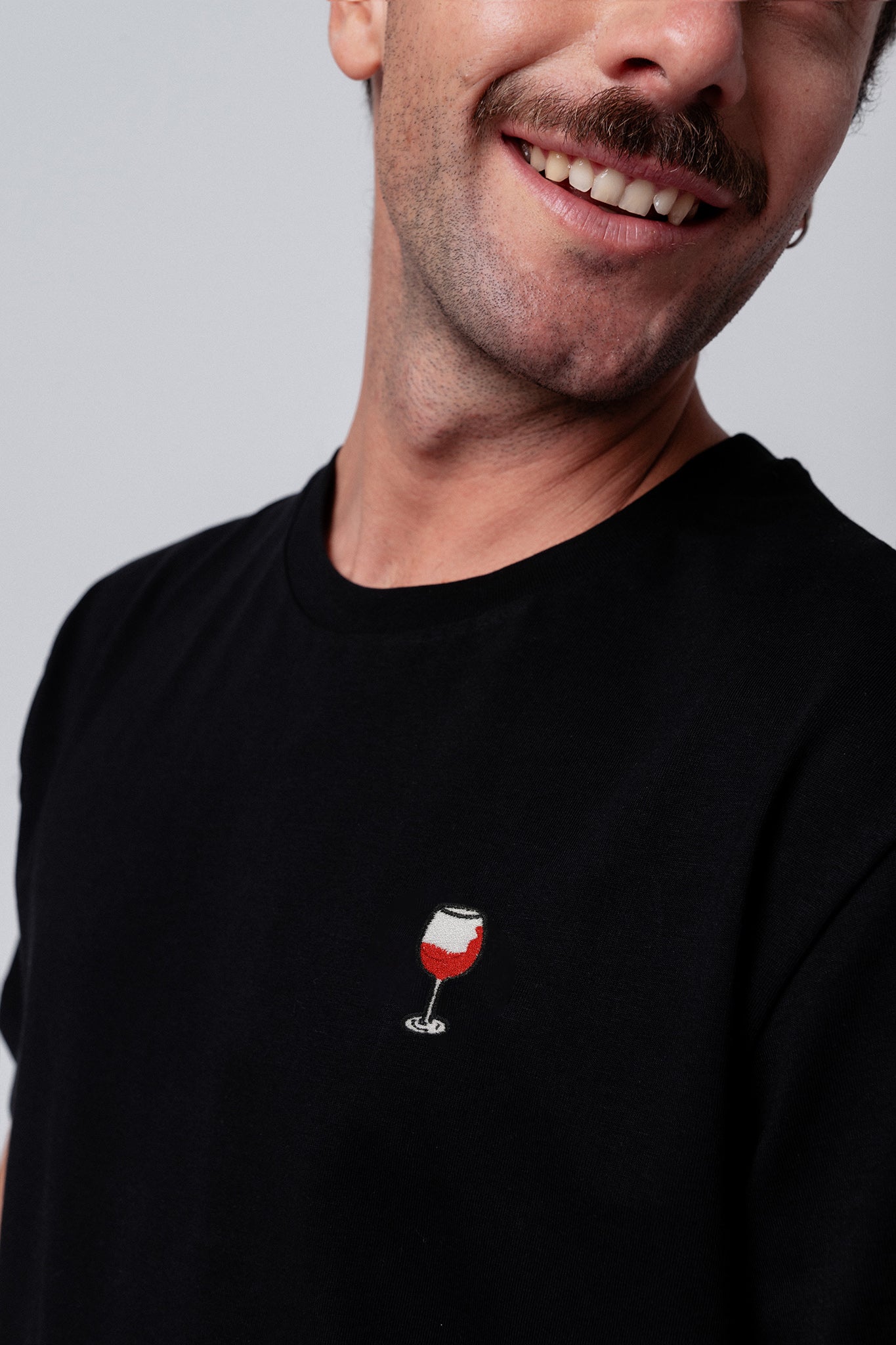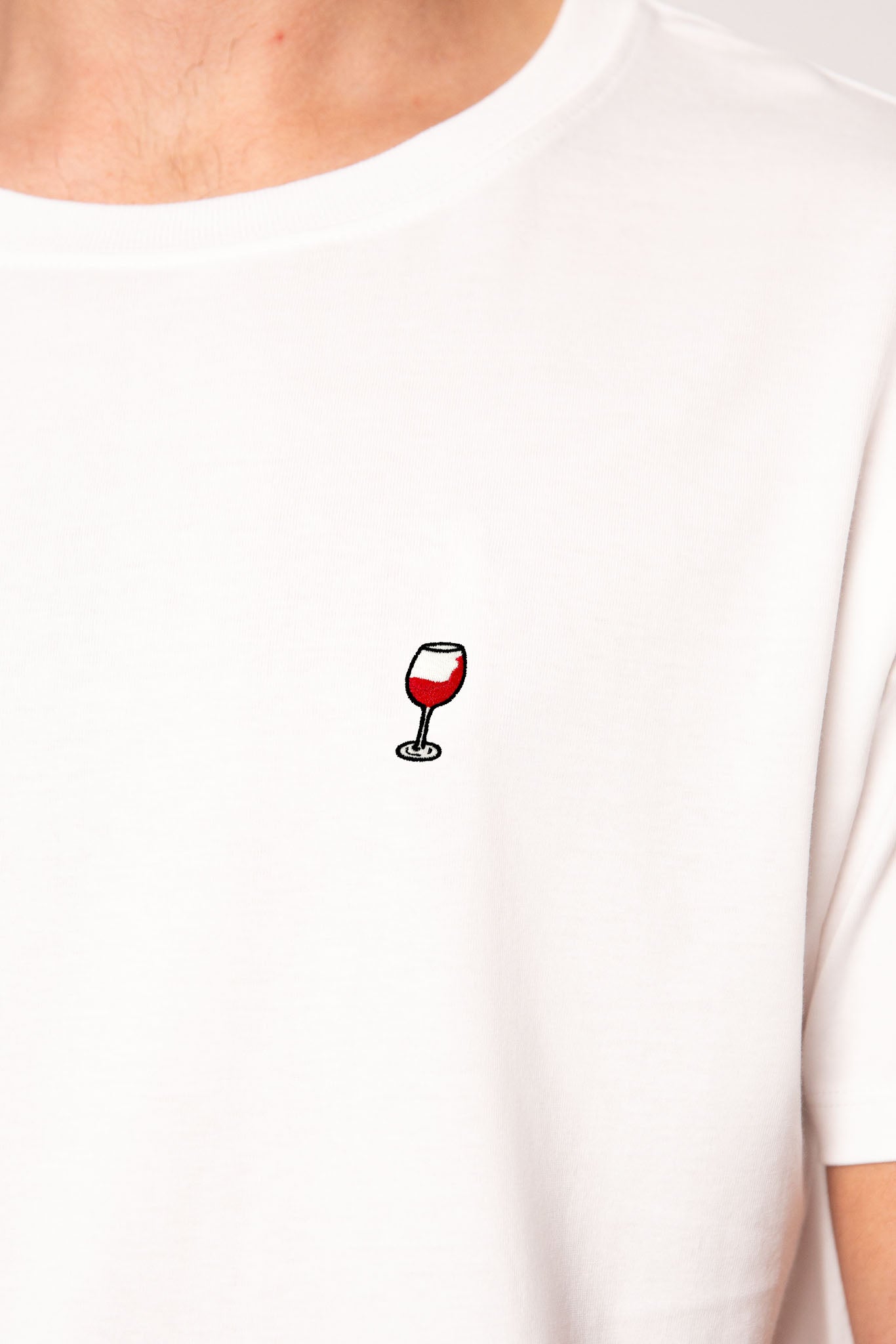 Besticktes Bio Baumwoll Unisex T-Shirt mit schwerem Stoff (190gsm) und gesticktem Glaserl Rotwein Design