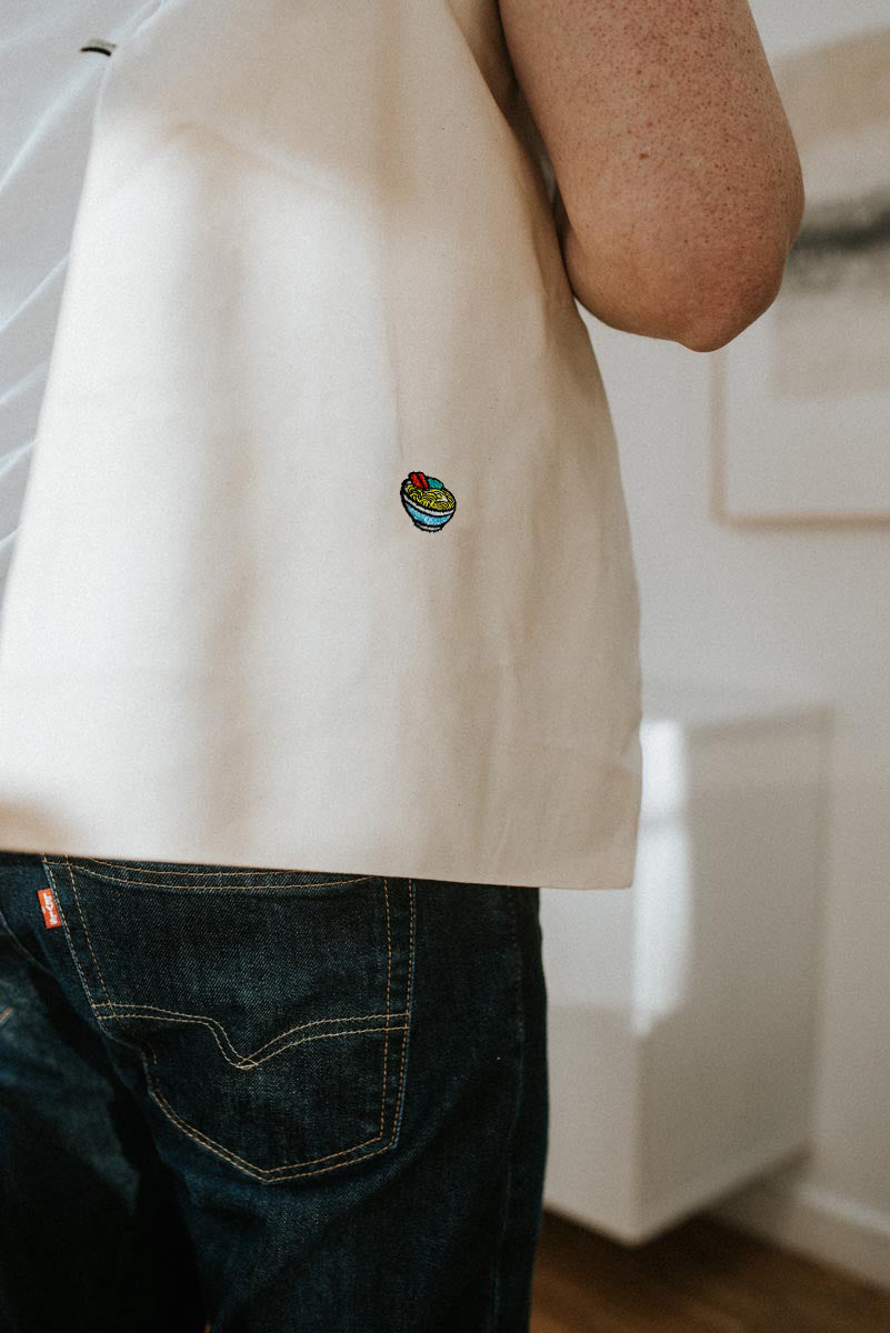 Bestickte, fair produzierte Bio-Baumwoll-Tragetasche im Ramen Design.
