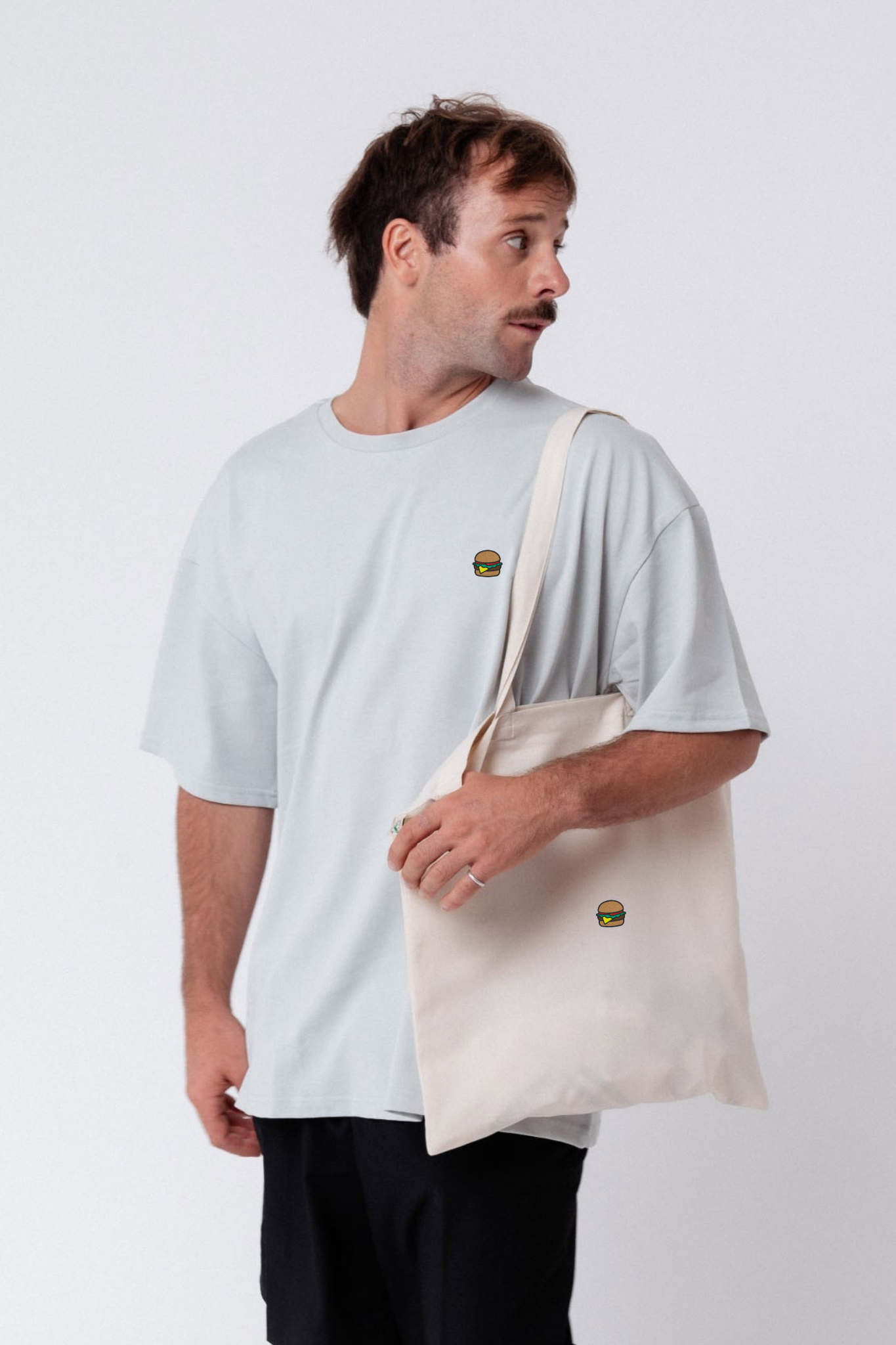 Bestickte, fair produzierte Bio-Baumwoll-Tragetasche im Burger Design.