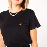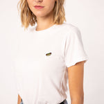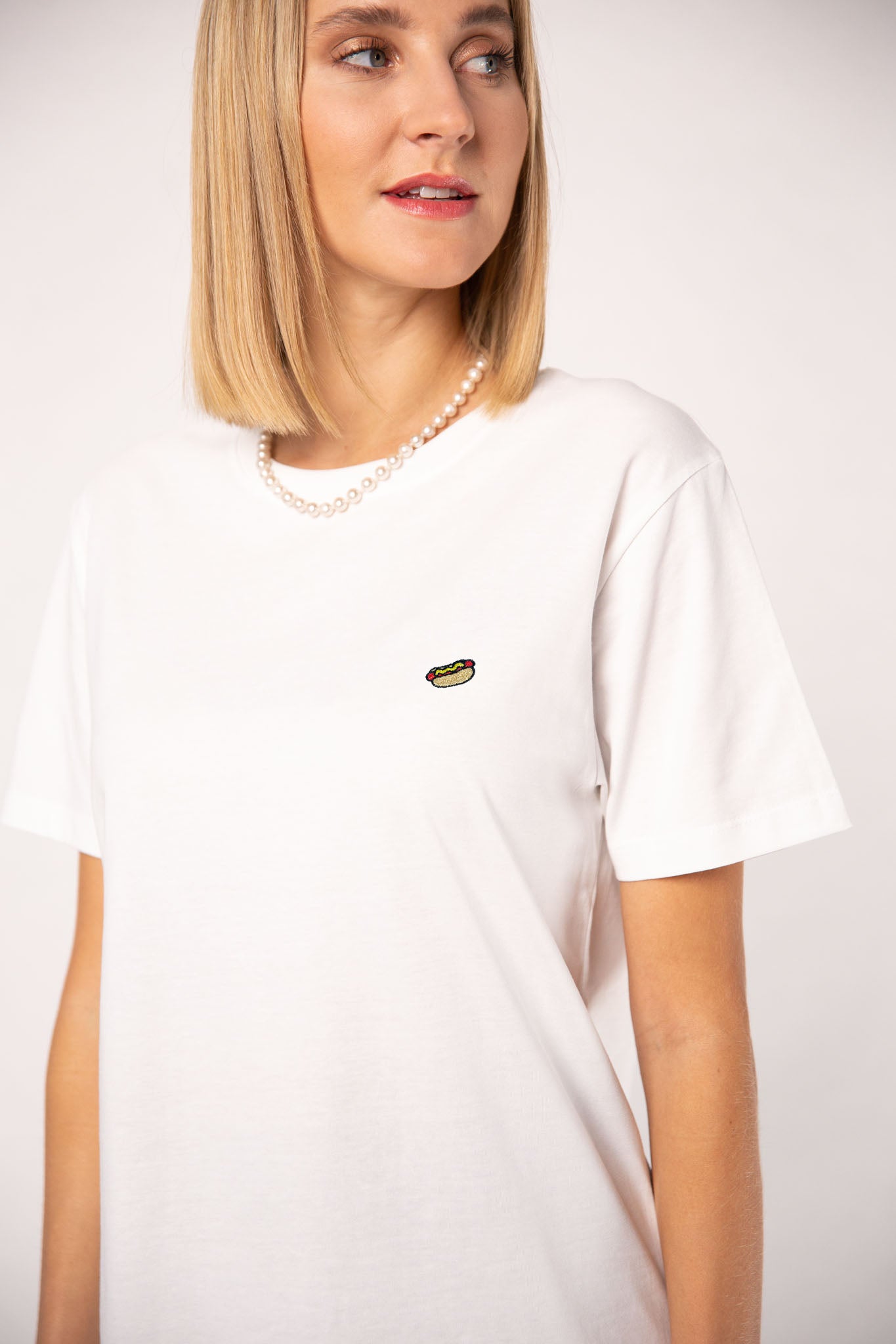 Besticktes Bio Baumwoll Frauen T-Shirt mit extrem angenehmen Stoff (155gsm) und gesticktem Hot Dog Design