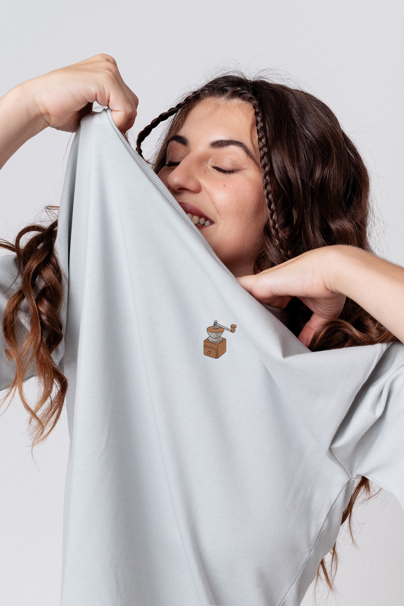 Heavy Oversized Bio Baumwoll T-Shirt mit extra schwerem Stoff (230gsm) und gesticktem Kaffeemühle Design